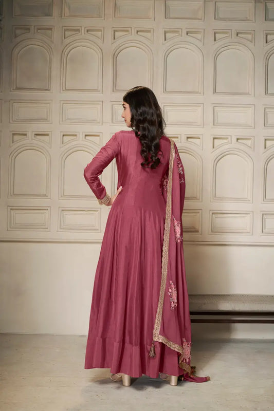 The gown and dupatta are exquisitely adorned with heavy zari embroidery, creating a majestic and festive aura — perfect for parties, receptions, weddings, and formal celebrations. The shoulder-to-daaman kali design adds graceful movement and flair, making the gown flow effortlessly with every step.