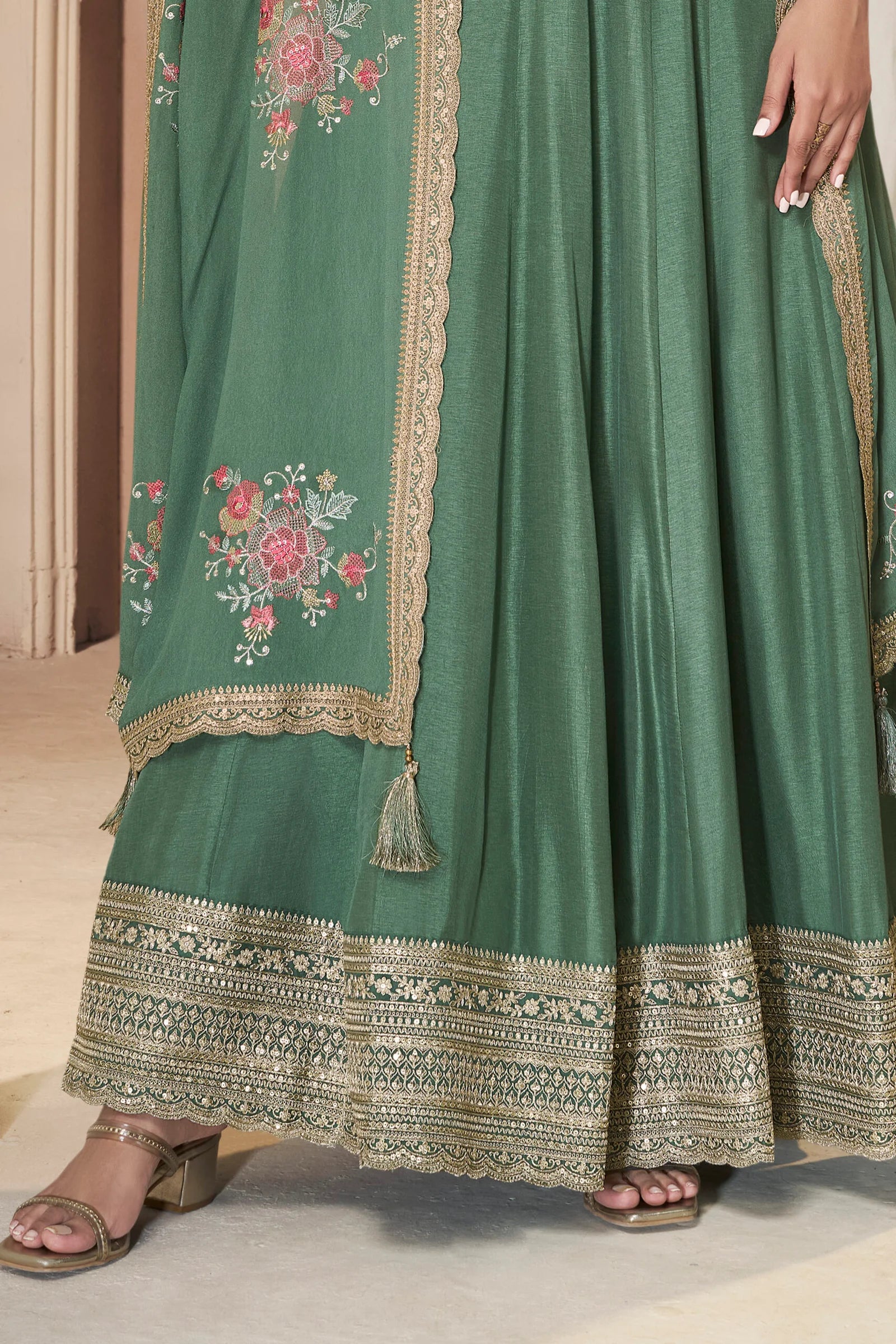 The gown and dupatta are exquisitely adorned with heavy zari embroidery, creating a majestic and festive aura — perfect for parties, receptions, weddings, and formal celebrations. The shoulder-to-daaman kali design adds graceful movement and flair, making the gown flow effortlessly with every step.